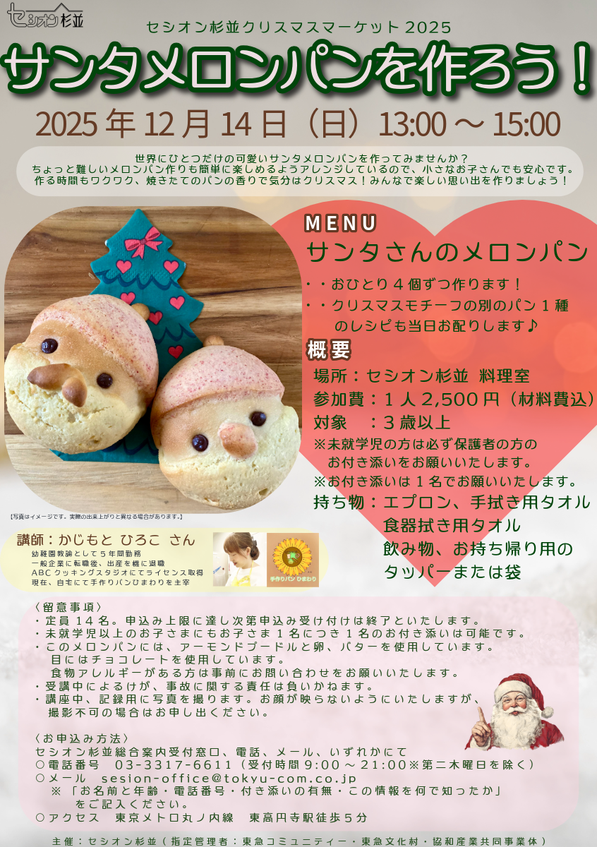 留意事項 | ・定員は14名までとなり、申込み上限に達し次第申込み受け付けは終了といたします。 ・未就学児以上のお子さまにもお子さま1名につき1名のお付き添いは可能です。 ・このメロンパンには、アーモンドプードルと卵、バターを使用しています。 サンタさんの目にはチョコレートを使用しています。 食物アレルギーがある方は事前にお問い合わせをお願いいたします。 ・受講中によるけが、事故に関する責任は負いかねます。 ・講座中、記録用に写真を撮ります。お顔が映らないようにいたしますが、 撮影不可の場合はお申し出ください。 |
