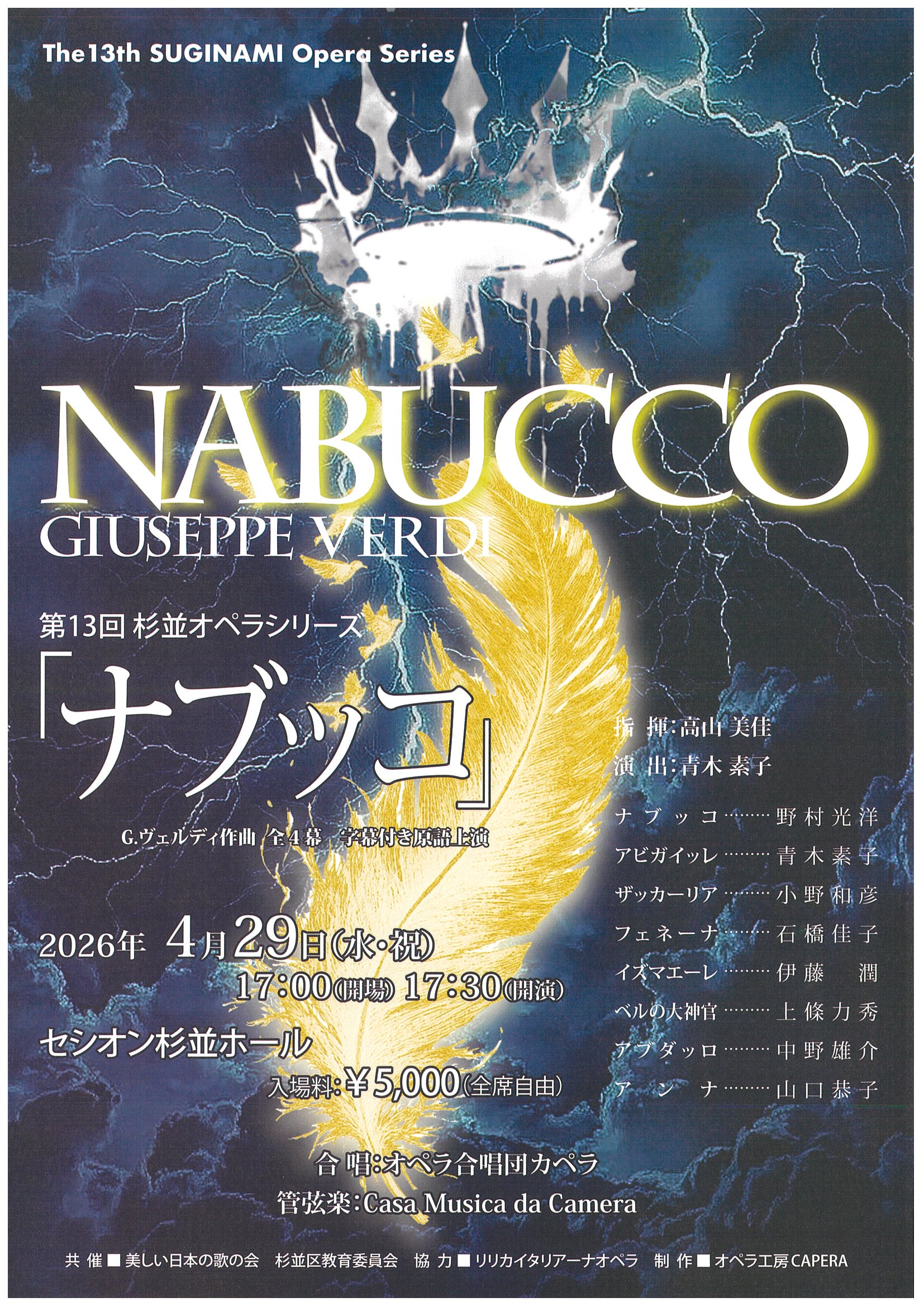 | 内容 | G.ヴェルディ作曲の全4幕オペラを字幕付き原語で上演。 合唱はオペラ合唱団カペラ、管弦楽はCasa Musica da Cameraによる。 指揮は高山美佳、演出は青木素子が担当。 |