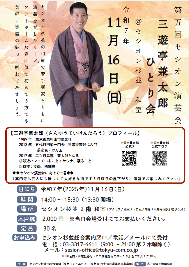 プロフィール | 1989 年東京都東村山市生まれ。2013 年五代目円楽一門会、三遊亭兼好に入門。前座名、けん玉。2017 年二つ目昇進、兼太郎となる。 ○最近ハマっていること:サウナ、寝ること ○特技:変顔、格闘技 ○セシオン演芸会に向けて一言 「高円寺は芸人にも優しくて大好きな街!日曜日の昼下がりの落語、お気軽にお楽しみください。」 |