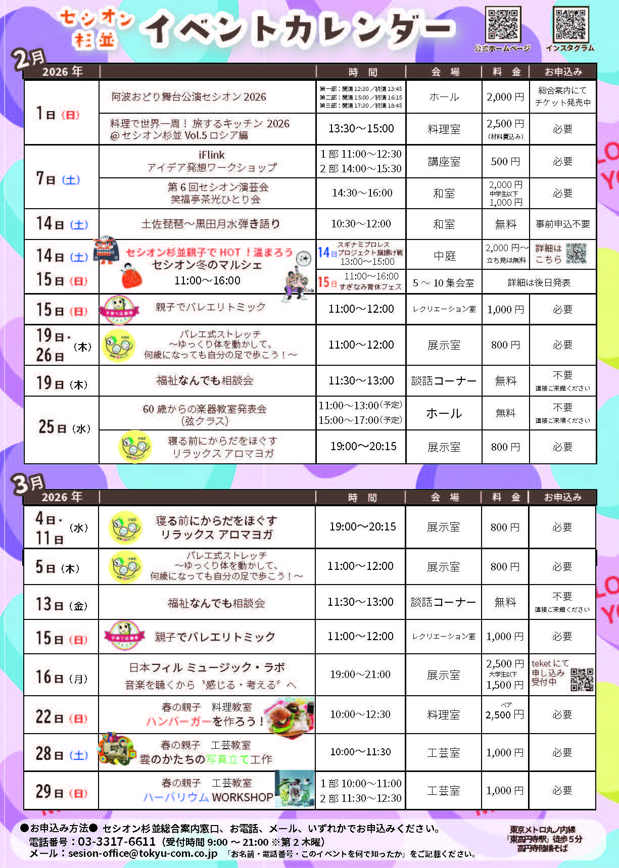 | お問い合わせ | セシオン杉並総合案内 電話番号:03-3317-6611(9:00~21:00 、休館日:第2木曜日、12/28~1/4) |